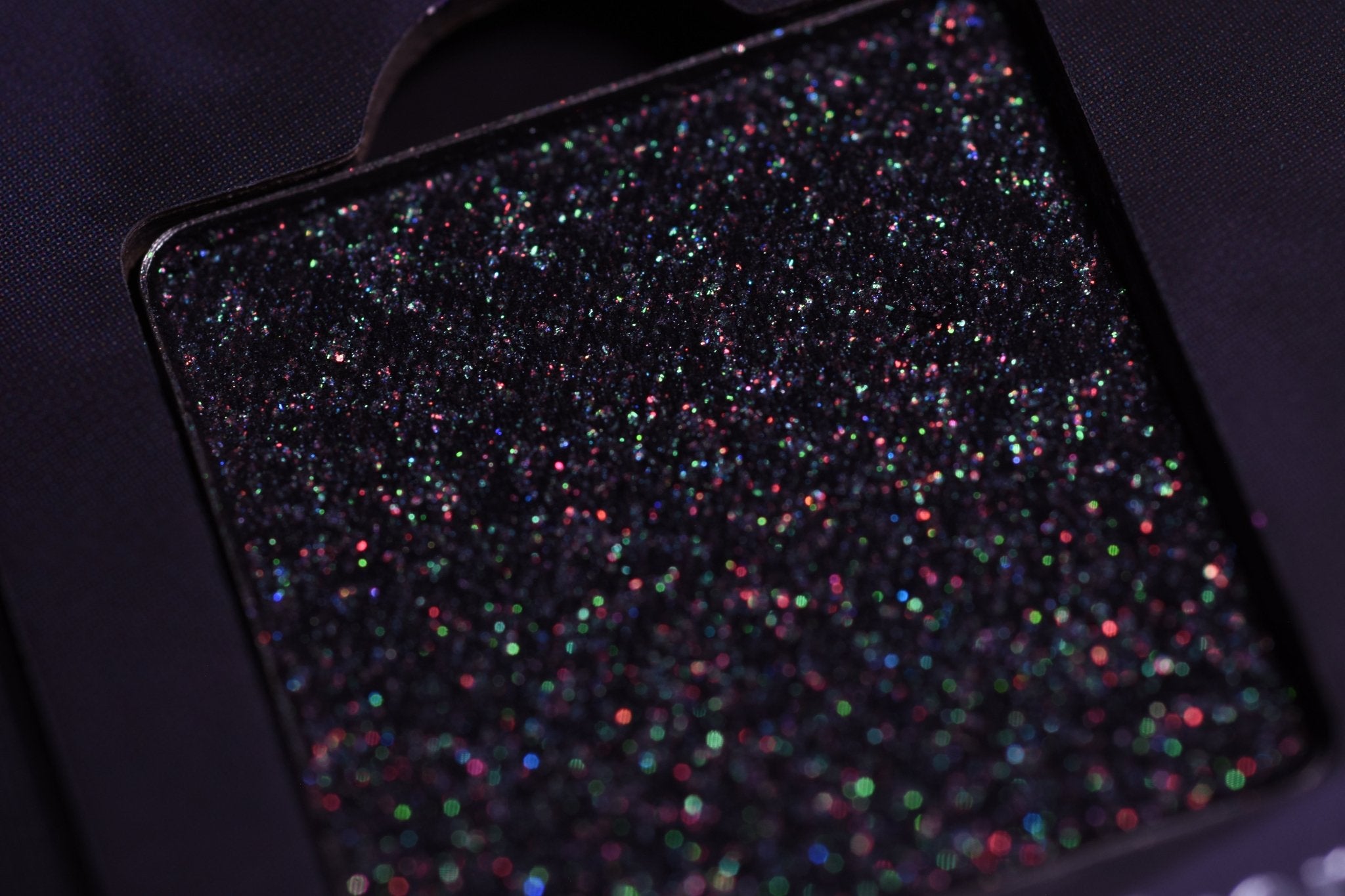 A dark multichrome shimmer with multicolored sparkle, reminiscent of Christmas tree lights.